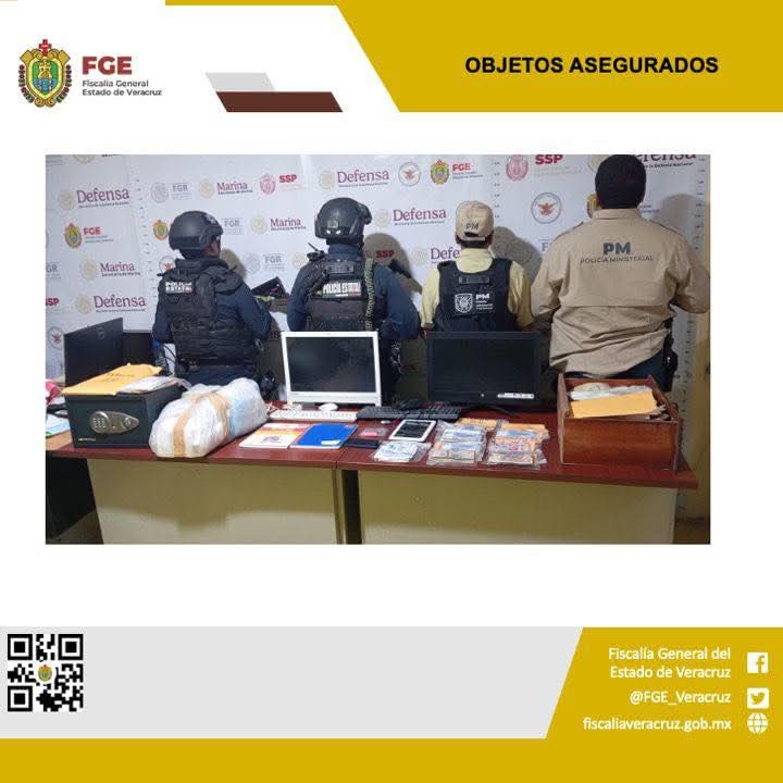 En el lugar se aseguró dinero en efectivo, memorias usb, documentos diversos, un teléfono celular, una tableta electrónica, una caja fuerte, libretas con anotaciones diversas y monitores de computadora.