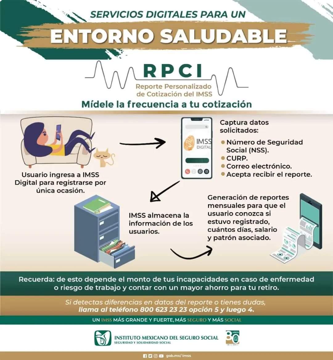 El Instituto Mexicano del Seguro Social (IMSS) en Veracruz Sur invita a los trabajadores afiliados a usar la herramienta digital Reporte Personalizado de Cotización (RPCI), la cual permite conocer de manera oportuna la situación del derechohabiente ante el Instituto, disponible en la aplicación IMSS Digital.