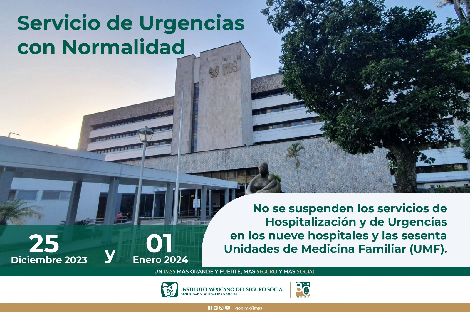 El Instituto Mexicano del Seguro Social (IMSS) en Veracruz Sur informa a la población derechohabiente que los días lunes 25 de diciembre de 2023 y lunes 01 de enero del 2024, no se suspenden los servicios de Hospitalización y de Urgencias en los nueve hospitales y las sesenta Unidades de Medicina Familiar (UMF).