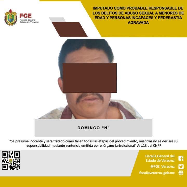 Ozuluama, Ver., 16 de marzo del 2025.-La Fiscalía General del Estado, a través de la Fiscalía Especializada en Investigación de Delitos de Violencia Contra la Familia, Mujeres, Niñas y Niños y de Trata de Personas, realizó imputación en contra de Domingo “N” como probable responsable de los delitos de abuso sexual a menores de edad y personas incapaces y pederastia agravada, cometido en agravio de dos víctimas adolescentes de identidad resguardada, quienes resultan ser sus hijas.