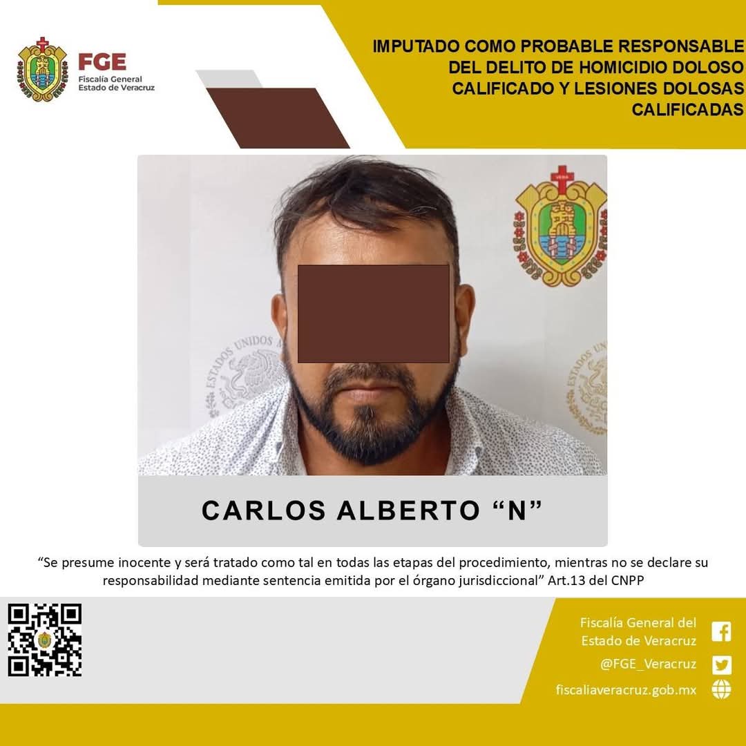 Coxquihui, Ver., 29 de mayo 2025.- Un Juez de control de esta demarcación judicial emitió imputación en contra de Carlos Alberto “N” como probable responsable del delito de homicidio doloso calificado en agravio de la víctima identificada con las iniciales G.A.V.D., y lesiones dolosas calificadas, cometido en agravio de las víctimas identificadas con las iniciales C.M.C., M.S.J., J.E.E., V.P.F., M.R.E., una menor de edad y una adolescente de identidades resguardadas.