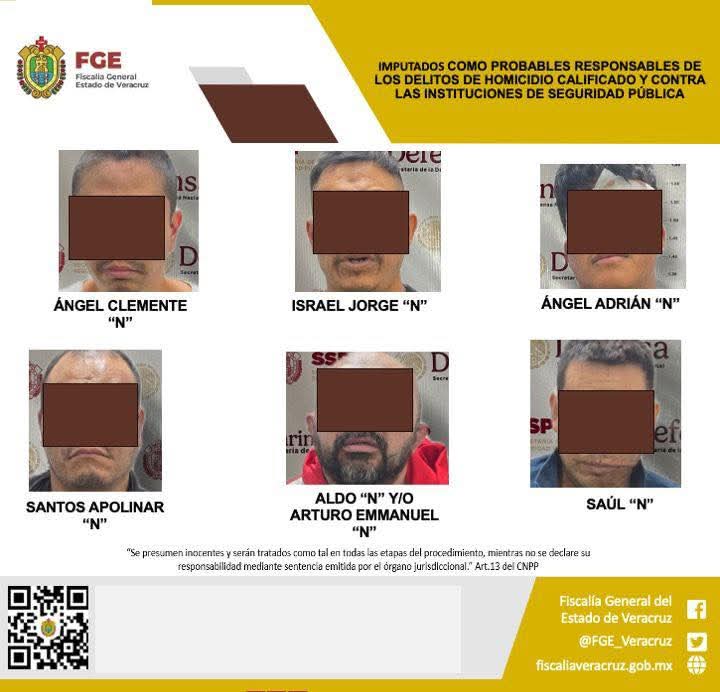 Tuxpan, Ver., 9 de marzo 2025.-La Fiscalía General del Estado, a través de la Fiscalía Regional Tuxpan realizó imputación en contra de Ángel Clemente “N”, presunto autor material, Israel Jorge “N”, Ángel Adrián “N”, Santos Apolinar “N”, Aldo “N” y/o Arturo Emmanuel “N” y Saúl “N”, como probables responsables del delito de homicidio calificado, en agravio de la víctima R.P.M., quien se desempeñaba como encargado de la Segunda Comandancia de Tuxpan, así como por el delito contra las instituciones de seguridad pública.