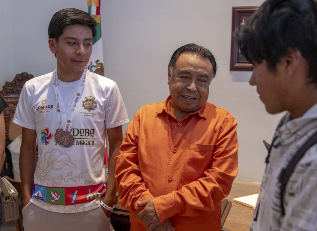Córdoba Ver. 26 de febrero de 2025.- El alcalde Juan Martínez Flores recibió a los ciclistas ganadores de medallas durante los juegos CONADE Valeria Castillo Aguilar y Didier García a quienes les reconoció su esfuerzo y los felicitó por haber ganado las preseas.