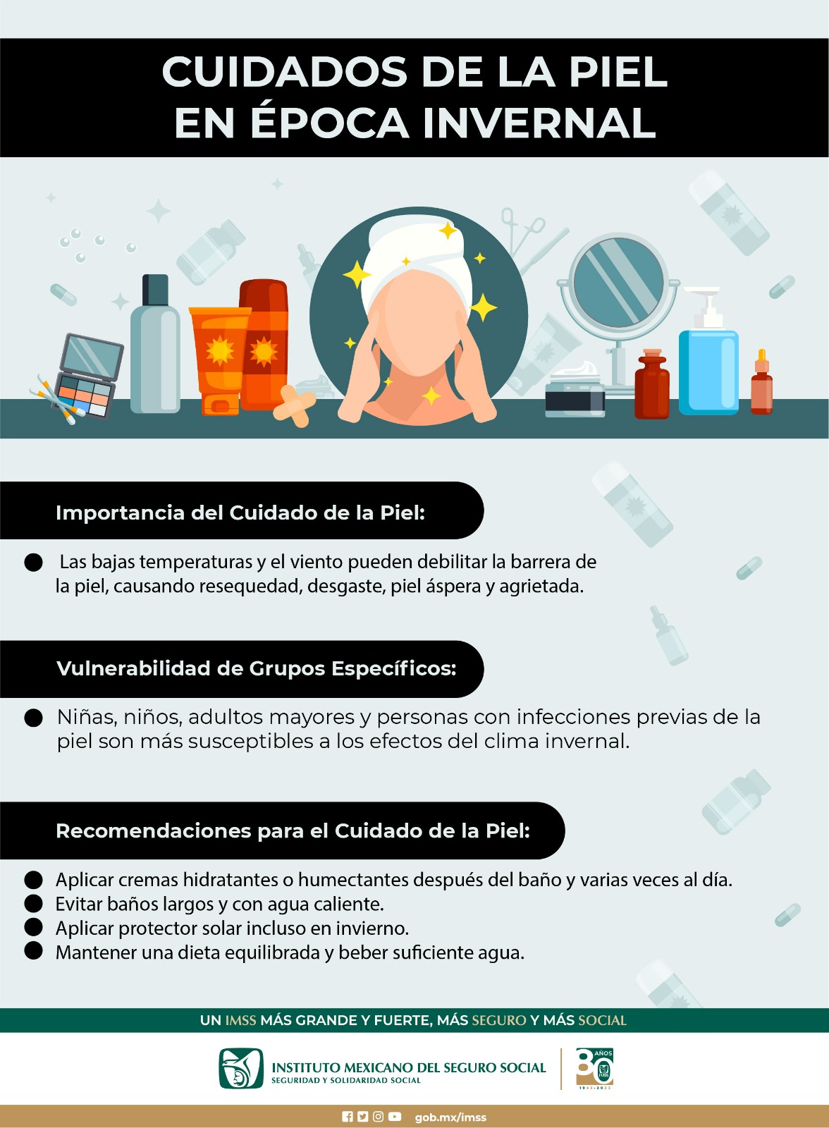 El Instituto Mexicano del Seguro Social (IMSS) en Veracruz Sur destaca la importancia de cuidar la piel durante la temporada invernal, ya que cuando el clima es frío y seco puede afectar la salud, principalmente de niñas, niños, personas adultas mayores y con infecciones previas de la piel, por ser más susceptibles.