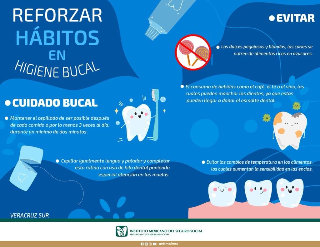 Durante las vacaciones decembrinas muchas personas exceden su consumo de azucares y con ello descuidan su salud bucal, por ello, el Instituto Mexicano del Seguro Social (IMSS) en Veracruz Sur exhorta a la población a cuidar sus hábitos alimenticios y mantener la higiene bucodental para prevenir caries y enfermedades de las encías, y mal aliento.