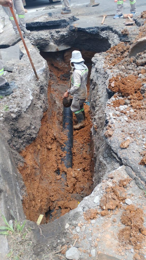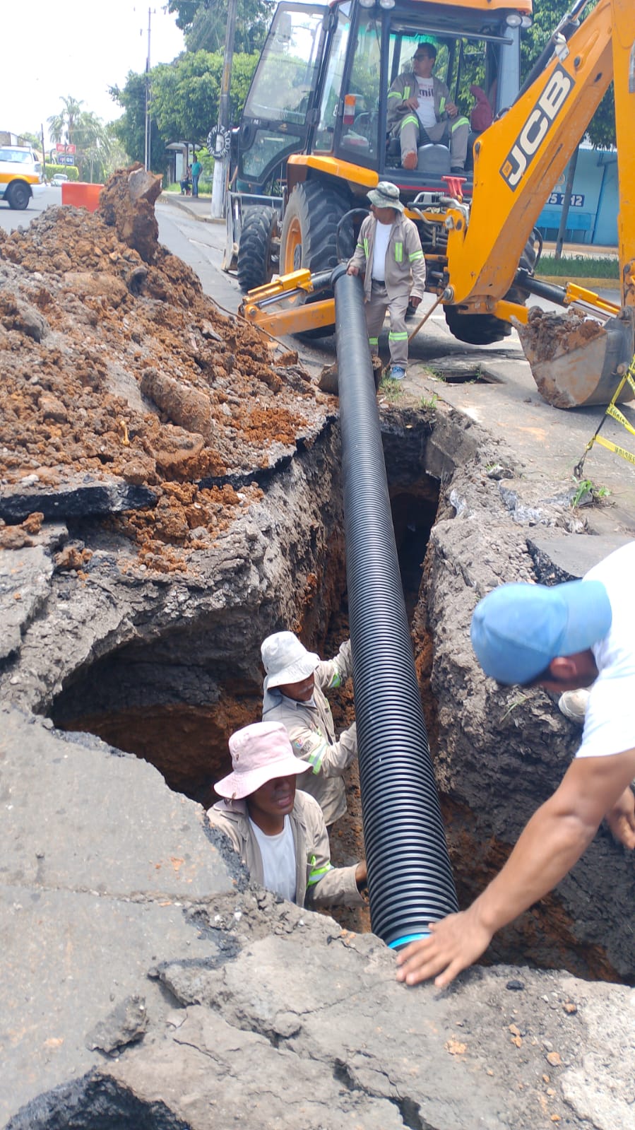Agentes viales adscritos a la dirección de Tránsito, Movilidad y Seguridad Vial brindan abanderamiento vehicular, mientras que una cuadrilla de Hidrosistema hace la reparación donde se hará el cambio de seis metros con tubería Pead. A la par, se dará mantenimiento a un pozo detectado en la ejecución de los trabajos.