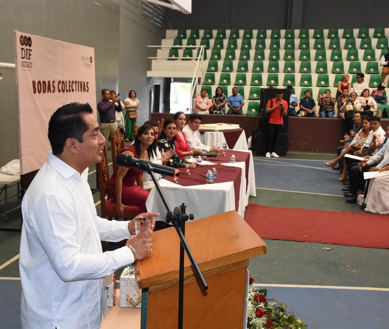 Fortín, Ver. – “Aquí estamos uniendo nuestras vidas y dando certeza legal al matrimonio, se deben casar por amor, no se debe dejar desamparada a la pareja por ello es importante legalizarlo”, fue el mensaje que brindaron Jaime Rivas y María de la Cruz una de las 92 parejas que contrajeron matrimonio en las Bodas Colectivas efectuadas la tarde de este miércoles.