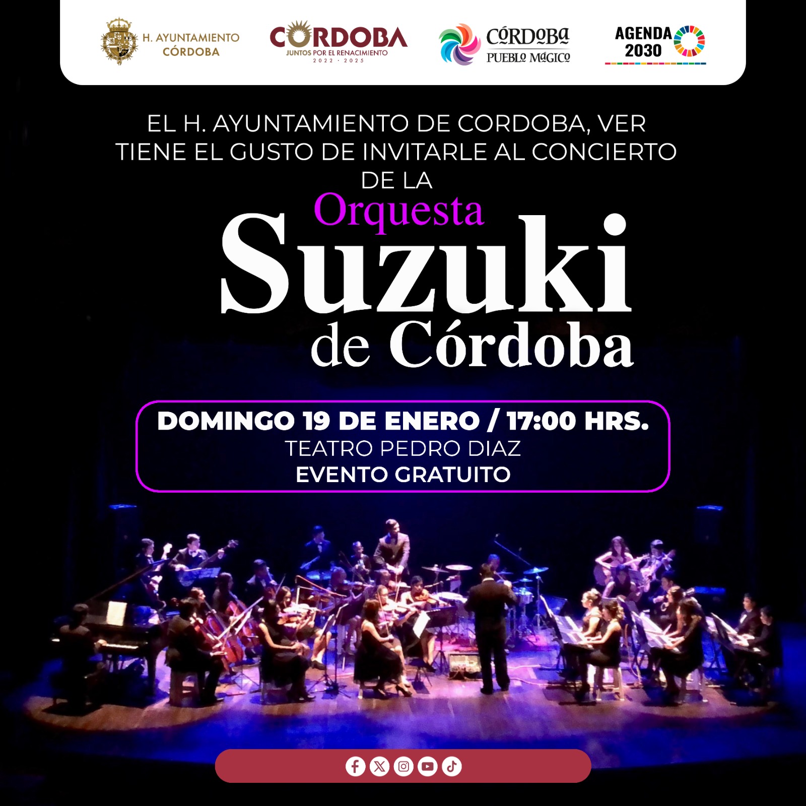 Córdoba Ver. 13 de enero de 2025.- Una tarde de música y alegría se ha organizado para este domingo 19 de enero a las 5 de la tarde, como parte del programa, que ofrece el Ayuntamiento de Córdoba a través de la coordinación de Cultura, con la presentación de la Orquesta Suzuki en el Teatro Pedro Díaz.