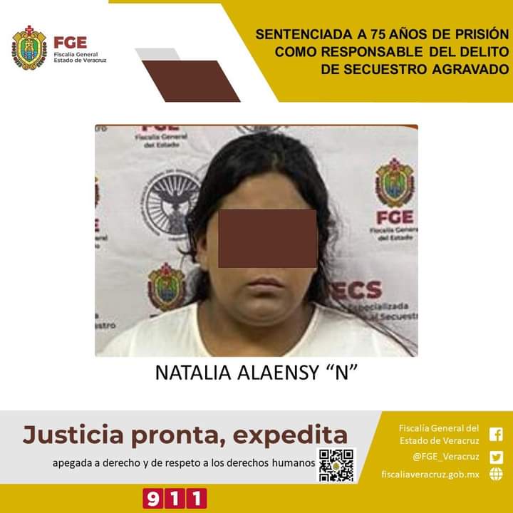 Xalapa, Ver., 17 de octubre 2023.- La Unidad Especializada en Combate al Secuestro logró sentencia condenatoria de 75 años de prisión en contra de Natalia Alaensy “N” como responsable del delito de secuestro agravado en agravio de una víctima identificada con las iniciales C.V.C.C.