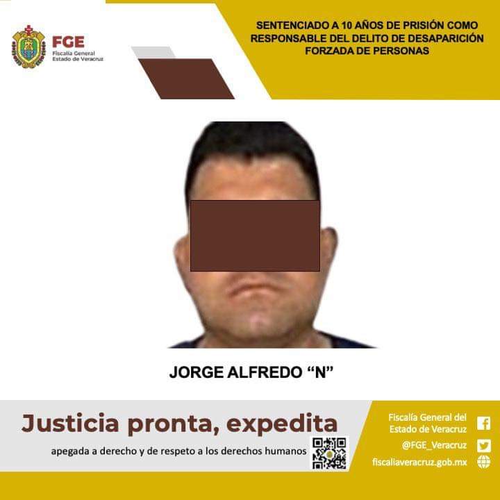 Xalapa, Ver., a 29 de noviembre del 2024.-La Fiscalía General del Estado, a través de la Fiscalía Regional Xalapa, logró sentencia condenatoria de 10 años de prisión en contra de Jorge Alfredo “N”, como responsable del delito de desaparición forzada de personas, cometido en agravio de la víctima identificada con las iniciales C.D.M.B.L.