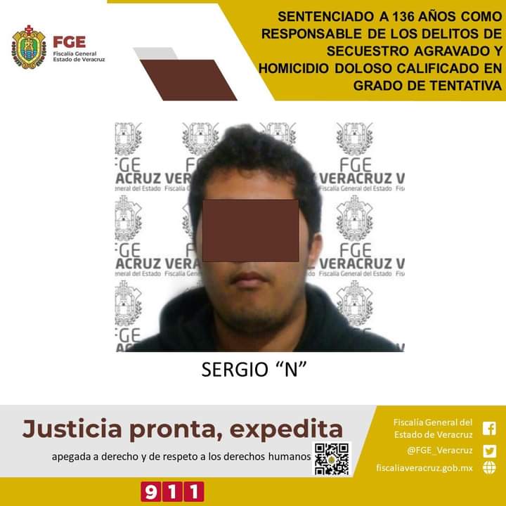 San Andrés Tuxtla, Ver., 19 de Junio 2023.- La Fiscalía Regional Cosamaloapan logró sentencia condenatoria de 136 años de prisión en contra de Sergio “N” como responsable de los delitos de secuestro agravado y homicidio doloso calificado en grado de tentativa.
