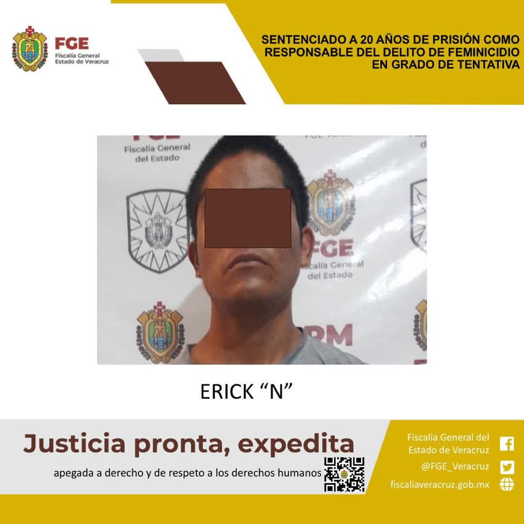 Zongolica, Ver., a 2 de abril del 2025.- La Fiscalía General del Estado, a través de la Fiscalía Especializada en Investigación de Delitos de Violencia Contra la Familia, Mujeres, Niñas y Niños y Trata de Personas logró sentencia condenatoria de 20 años de prisión en contra de Erick “N” como responsable del delito de feminicidio en grado de tentativa en agravio de una víctima de identidad resguardada.