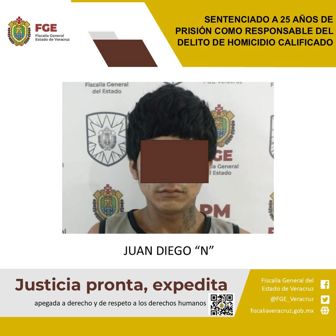Veracruz, Ver., – 26 de febrero 2025.- La Fiscalía Regional Veracruz logró sentencia condenatoria de 25 años de prisión en contra de Juan Diego “N” como responsable del delito de homicidio calificado en agravio de J.C.M.J.