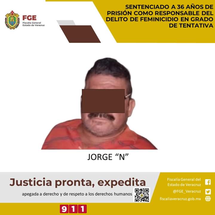 Orizaba, Ver., 22 de noviembre 2023.- La Fiscalía Especializada en Delitos de Violencia Contra la Familia, Mujeres, Niñas y Niños y Trata de Personas logró sentencia condenatoria de 36 años de prisión en contra de Jorge “N” como responsable del delito feminicidio en grado de tentativa en agravio de su expareja sentimental.