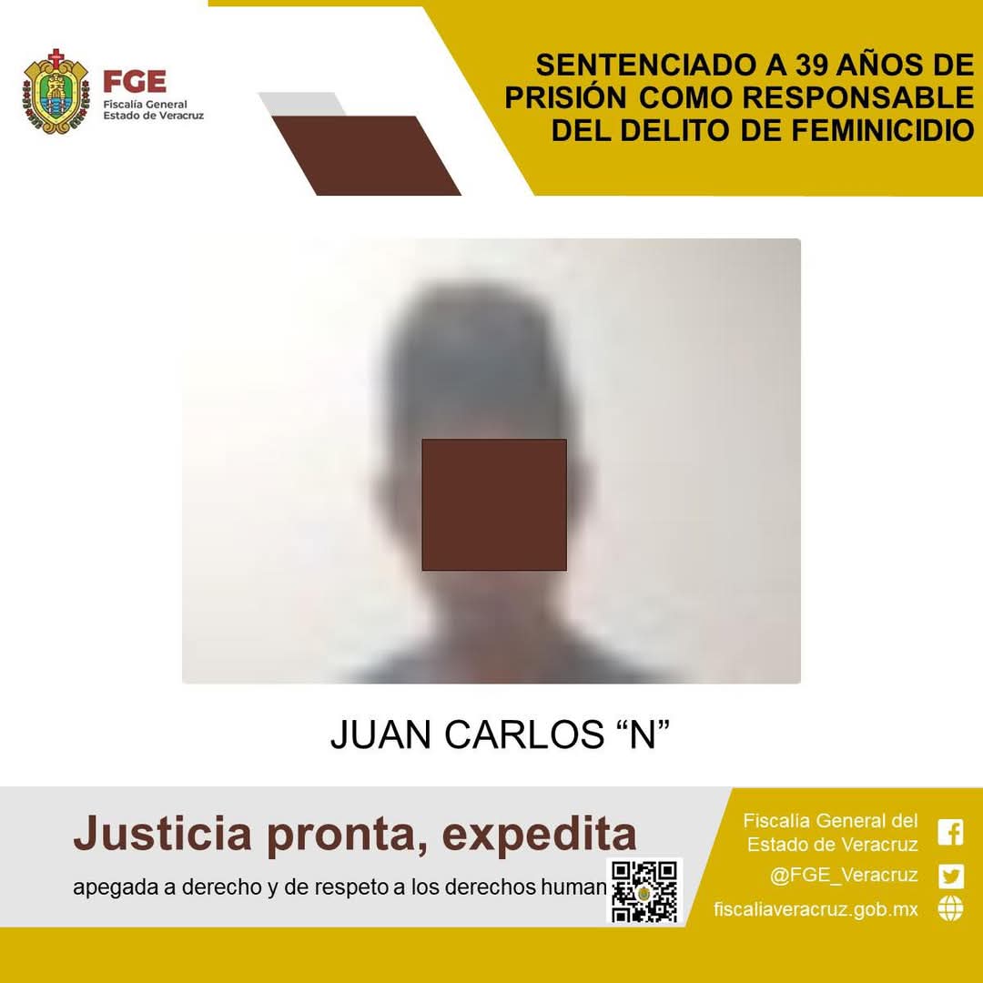 Veracruz, Ver., 09 de abril 2025.- La Fiscalía General del Estado, a través de la Fiscalía Especializada en Investigación de Delitos de Violencia Contra la Familia, Mujeres, Niñas y Niños y de Trata de Personas logró sentencia condenatoria de 39 años de prisión en contra de Juan Carlos “N” como responsable del delito de feminicidio cometido en agravio de la víctima con identidad resguardada.