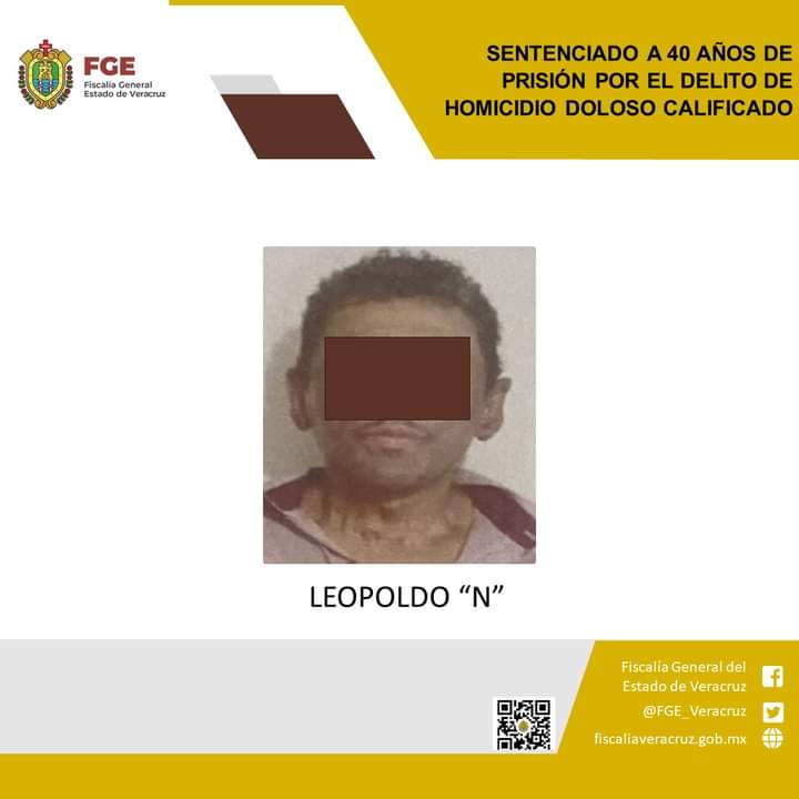 Córdoba, Ver., 26 de Febrero 2024.- La Fiscalía Regional Córdoba logró sentencia condenatoria de 40 años de prisión en contra de Leopoldo “N” como responsable del delito de homicidio doloso calificado cometido en agravio de la víctima F.J.F.V.