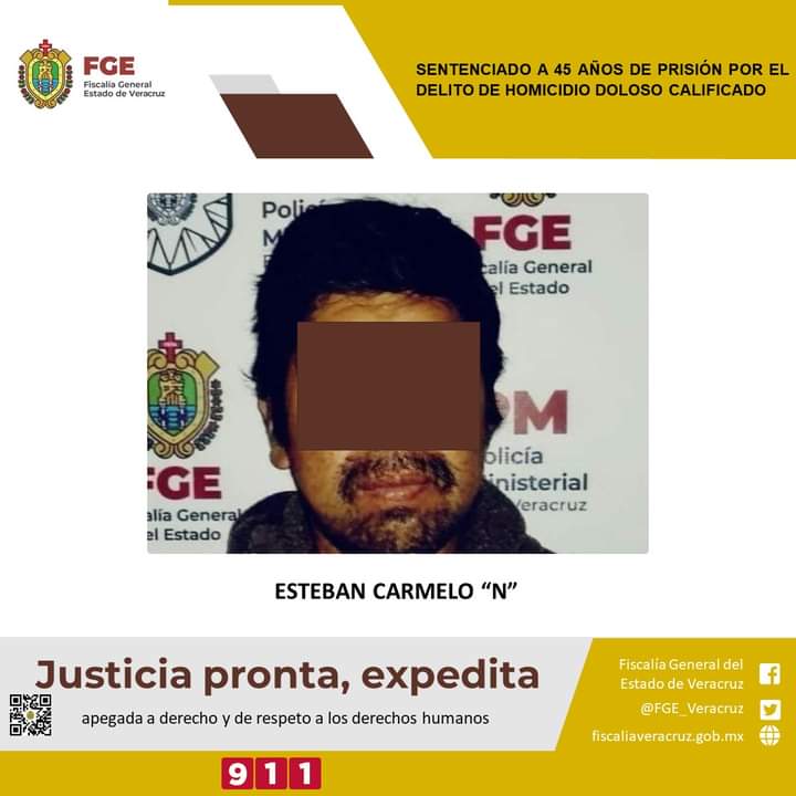 Córdoba, Ver., 31 de Enero 2024.- La Fiscalía Regional Córdoba logró en sentencia condenatoria de 45 años de prisión en contra de Esteban Carmelo “N” como responsable del delito de homicidio doloso calificado cometido en agravio de la víctima G.O.M.