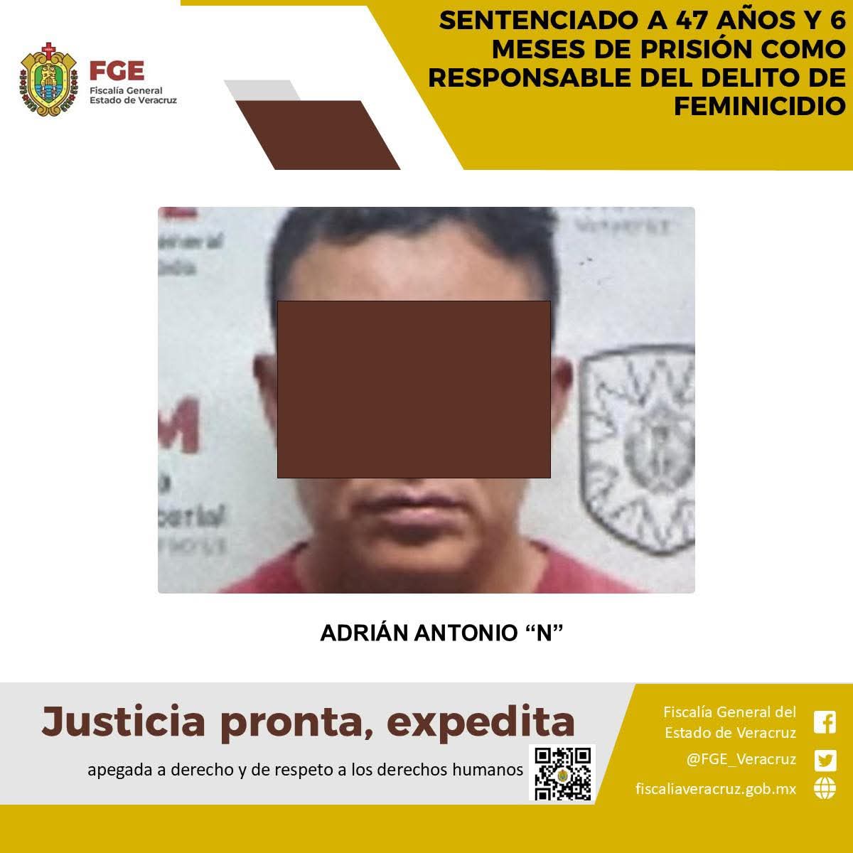 Xalapa, Ver., 11 de julio 2025.- La Fiscalía General del Estado, a través de la Fiscalía Coordinadora Especializada en Delitos contra las Mujeres, Feminicidio, Familia y Trata de Personas, logró sentencia condenatoria de 47 años y 6 meses de prisión en contra de Adrián Antonio “N” como responsable del delito de feminicidio, cometido en agravio de una víctima de identidad resguardada.