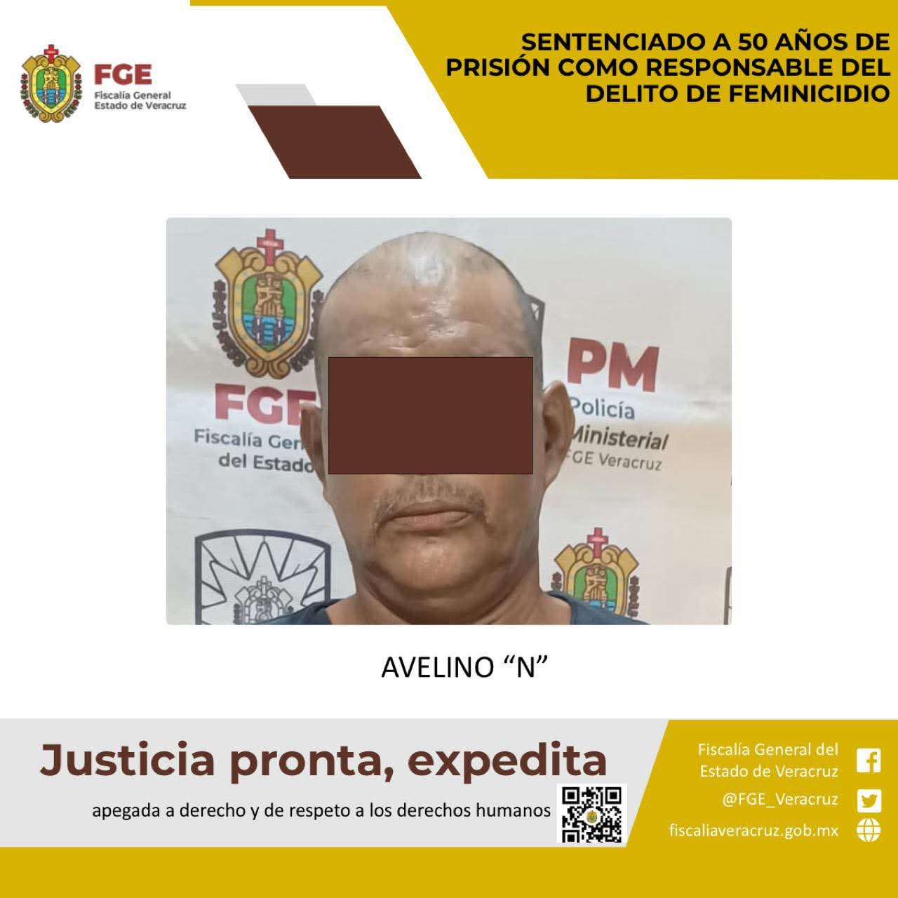 Cosamaloapan, Ver., a 24 de junio del 2025.- La Fiscalía General del Estado, a través de la Fiscalía Especializada en Delitos de Violencia contra la Familia, Mujeres, Niñas y Niños y Trata de Personas, logró sentencia condenatoria de 50 años de prisión en contra de Avelino “N” como responsable del delito de feminicidio en agravio de una víctima de identidad resguardada, quien resultaba ser su concubina.