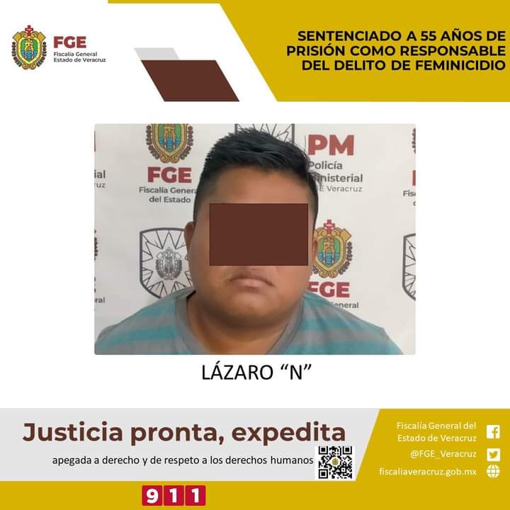 San Andrés Tuxtla, Ver., 27 de septiembre de 2023.- La Fiscalía Especializada en Investigación de Delitos de Violencia contra la Familia, Mujeres, Niñas y Niños y Trata de Personas logró sentencia condenatoria de 55 años de prisión en contra de Lázaro “N” como responsable del delito de feminicidio.