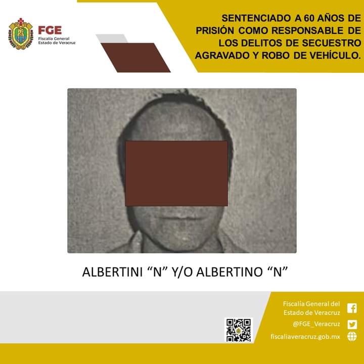 Tuxpan, Ver., 28 de mayo de 2024.- Un juez de control de este distrito judicial emitió sentencia condenatoria de 60 años de prisión en contra de Albertini “N” y/o Albertino “N” como responsable de los delitos de secuestro agravado y robo de vehículo, cometido en agravio de la víctima identificada con las iniciales F.N.V.A.