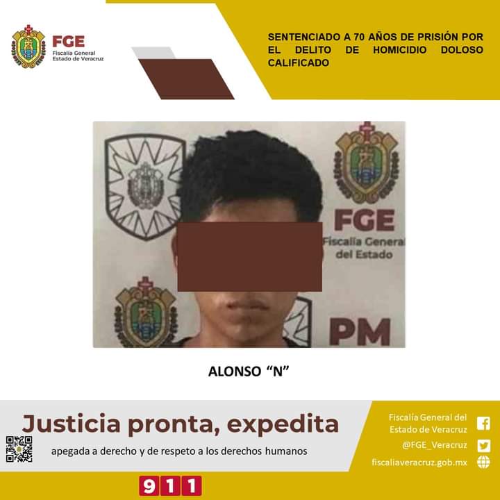 Boca del Río, Ver., 1° de diciembre de 2023.- La Fiscalía Regional Veracruz logró sentencia condenatoria de 70 años de prisión en contra de Alonso “N” como responsable del delito de homicidio doloso calificado cometido en agravio de las víctimas G.T.O., y J.M.P.R., quienes se desempeñaban como elementos de la Guardia Nacional, hechos acontecidos el 30 de enero del 2020, dentro del Juicio Oral 92/2022.