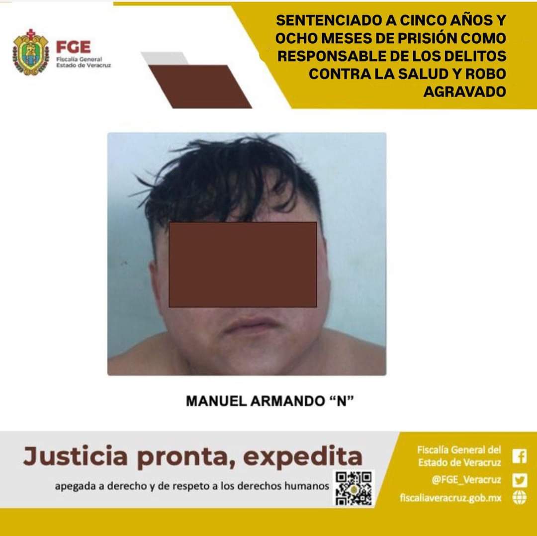 Tuxpan, Ver., a 6 de noviembre del 2024.-La Fiscalía General del Estado, a través de la Fiscalía Regional Tuxpan, logró sentencia condenatoria de cinco años y ocho meses de prisión en contra de Manuel Armando “N”, como responsable de los delitos contra la salud y robo agravado, en agravio de G.F.F.