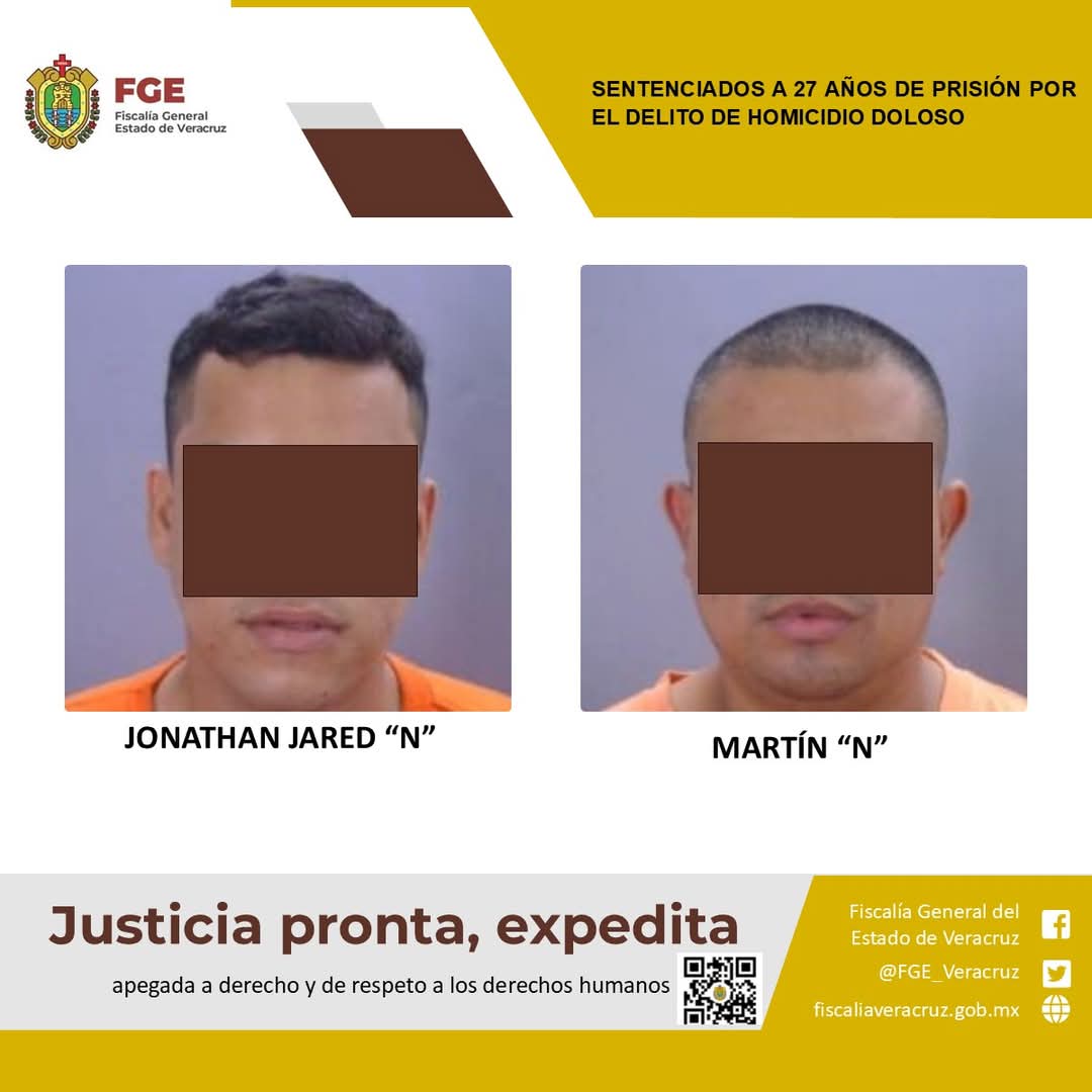 Coatzacoalcos, Ver., 06 de enero de 2025.- La Fiscalía Regional Coatzacoalcos logró sentencia condenatoria de 27 años de prisión en contra de Martín “N” y Jonathan Jared “N” como responsables del delito de homicidio doloso cometido en agravio de tres víctimas con identidades resguardadas.