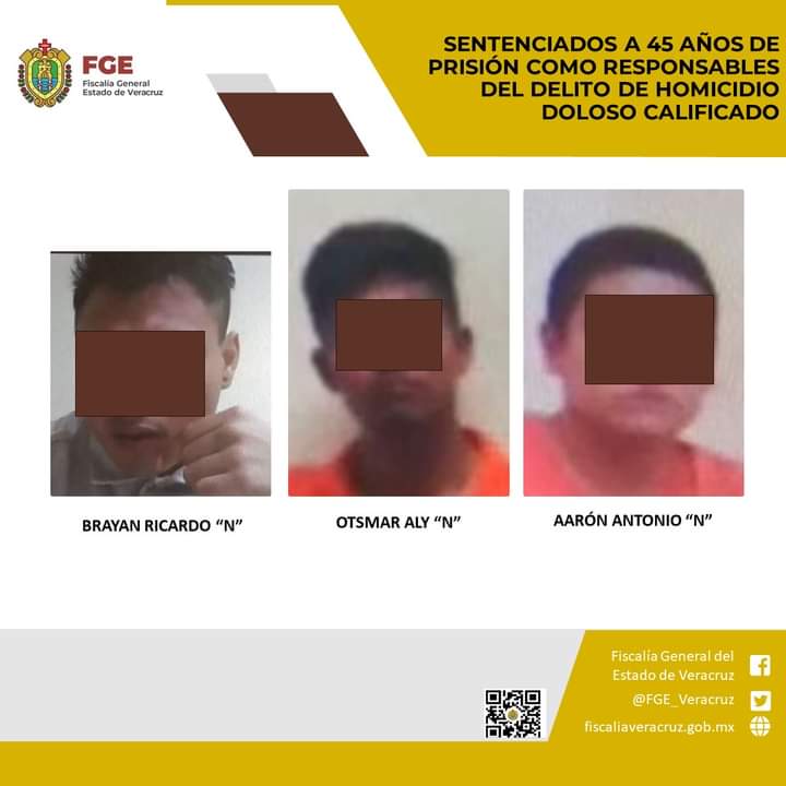 Minatitlán, Ver., 22 de mayo 2024.- Un juez de control de este distrito judicial emitió sentencia condenatoria de 45 años de prisión en contra de Brayan Ricardo “N”, Aarón Antonio “N” y Otsmar Aly “N” como responsables del delito de homicidio doloso calificado en agravio de la víctima identificada con las iniciales C.G.C.