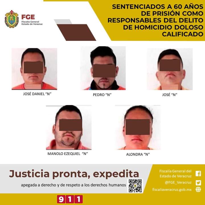Xalapa, Ver., 8 de noviembre de 2023.- La Fiscalía Regional Xalapa logró sentencia condenatoria de 60 años de prisión en contra de José “N”, José Daniel “N”, Pedro “N”, Alondra “N” y Manolo Ezequiel “N” como responsables del delito de homicidio doloso calificado en agravio de las víctimas identificadas con las iniciales F.G.H. y M.G.V.A.
