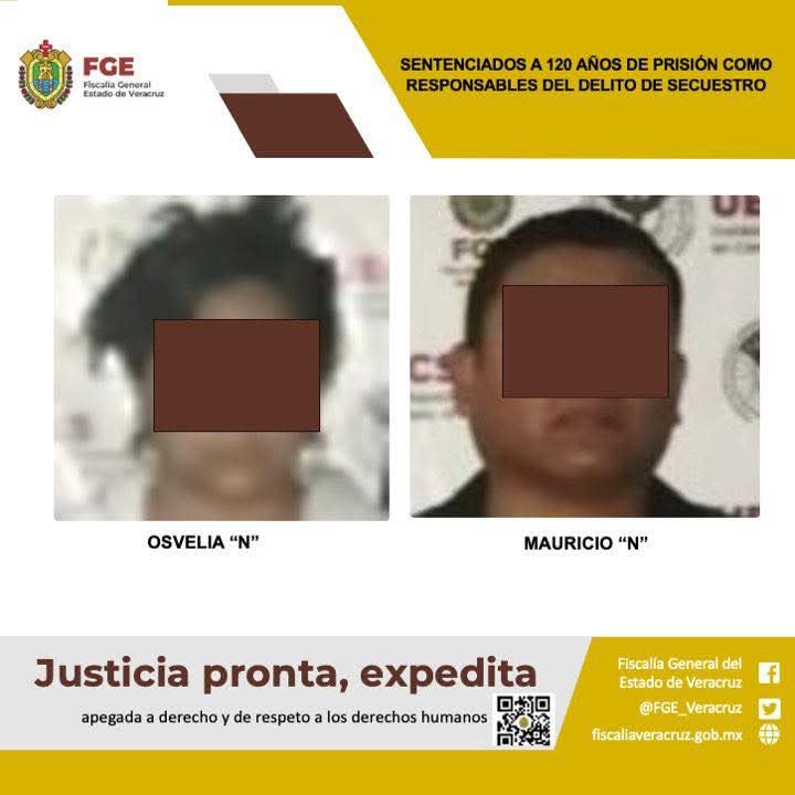 Córdoba, Ver.-La Fiscalía General del Estado, a través de la Unidad Especializada en Combate al Secuestro, logró sentencia condenatoria de 120 años de prisión en contra de Osvelia “N” y Mauricio “N”, como responsables del delito de secuestro, cometido en agravio de las víctimas identificadas con las iniciales O.R.M., y M.A.J.H.