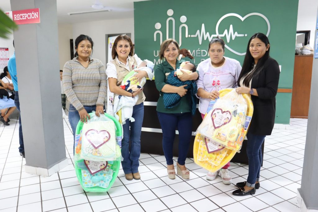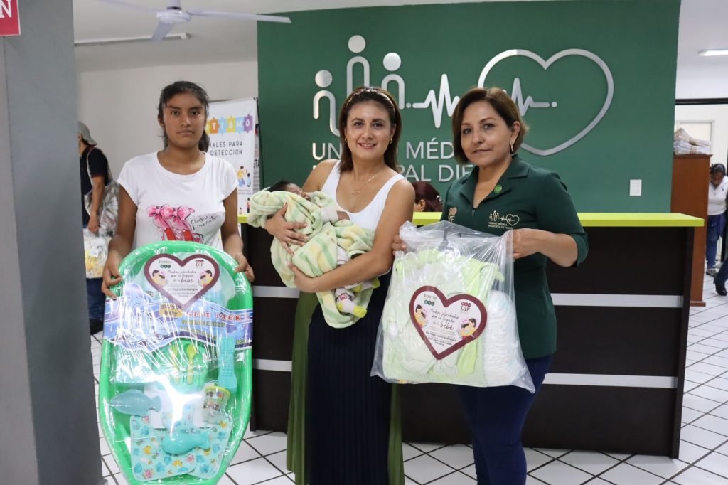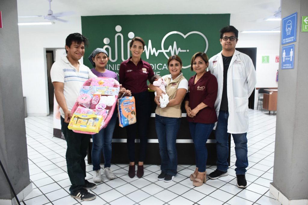 La presidenta del DIF municipal, Olga Juárez Rodríguez, en compañía de la directora del DIF municipal, Trinidad Puentes Esquivel y la coordinadora de salud, Rosario Merino Dominguez felicitó y entregó un obsequio a los nuevos papás, que agradecieron las atenciones durante su embarazo.