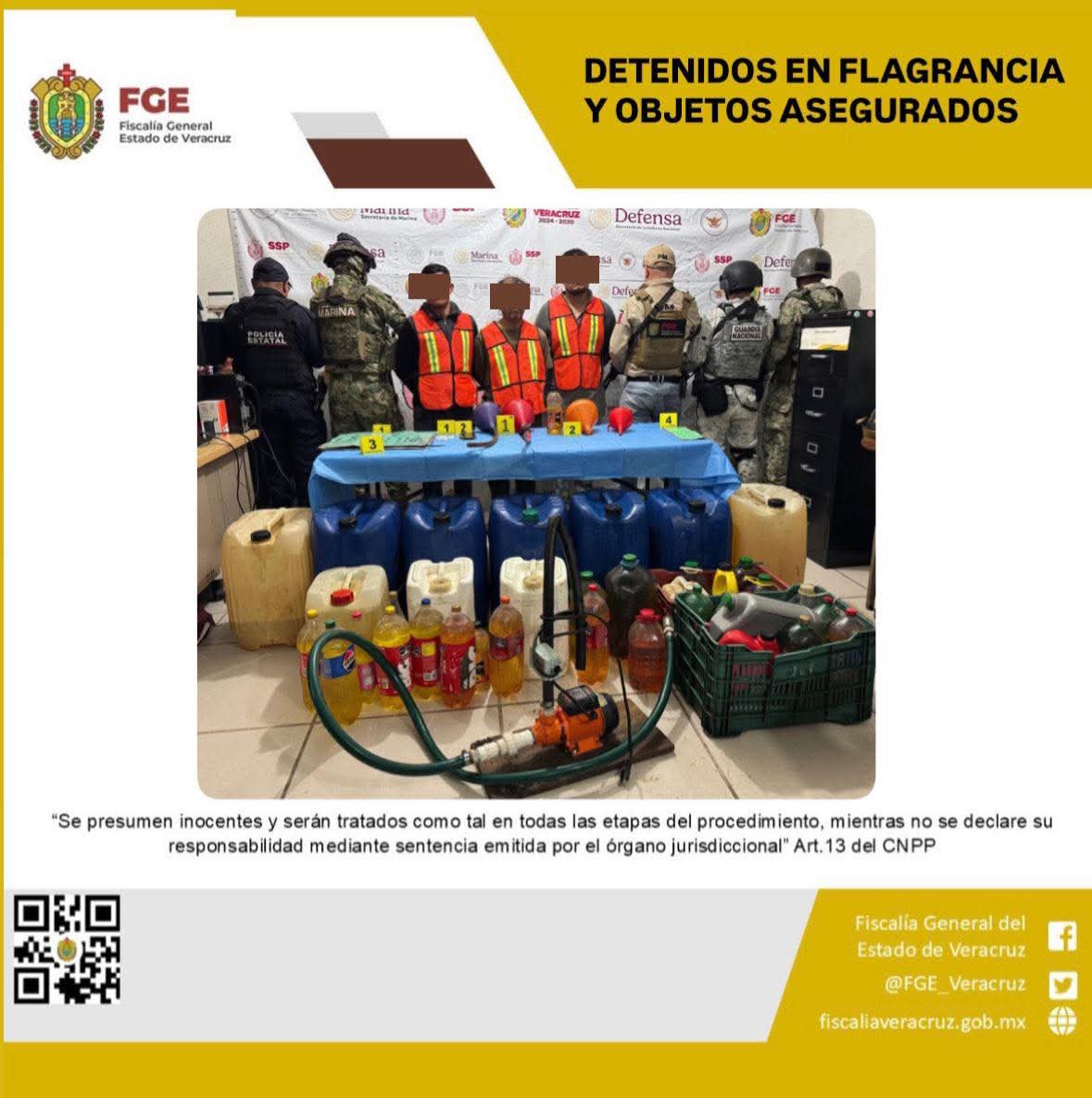 En dicho operativo se logró la detención en flagrancia de Edgar “N”, Antonio “N” y Marco Antonio “N”. Asimismo se aseguró un letrero de presunta venta de gasolina, vehículos, embudos con manguera, botellas con líquido, una cartulina con tabulador de precios de venta, polvo blanco granulado con características similares a las del cristal, un celular, bidones, botellas y galones de diferentes capacidades con líquido que aparenta ser gasolina y una bomba acoplada a una manguera verde.