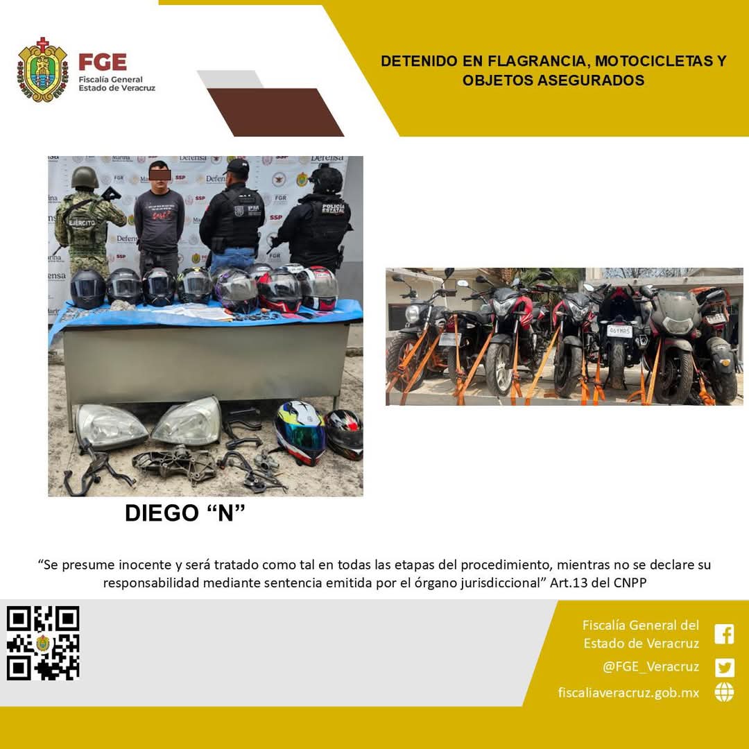 En el lugar se logró la detención en flagrancia de Diego “N”, así como el aseguramiento de hierba verde seca con características similares a las de la marihuana, diversas motocicletas, un automóvil, cascos para motocicleta, placas NIV, documentos diversos, teléfonos celulares, múltiples llaves y autopartes para moto.