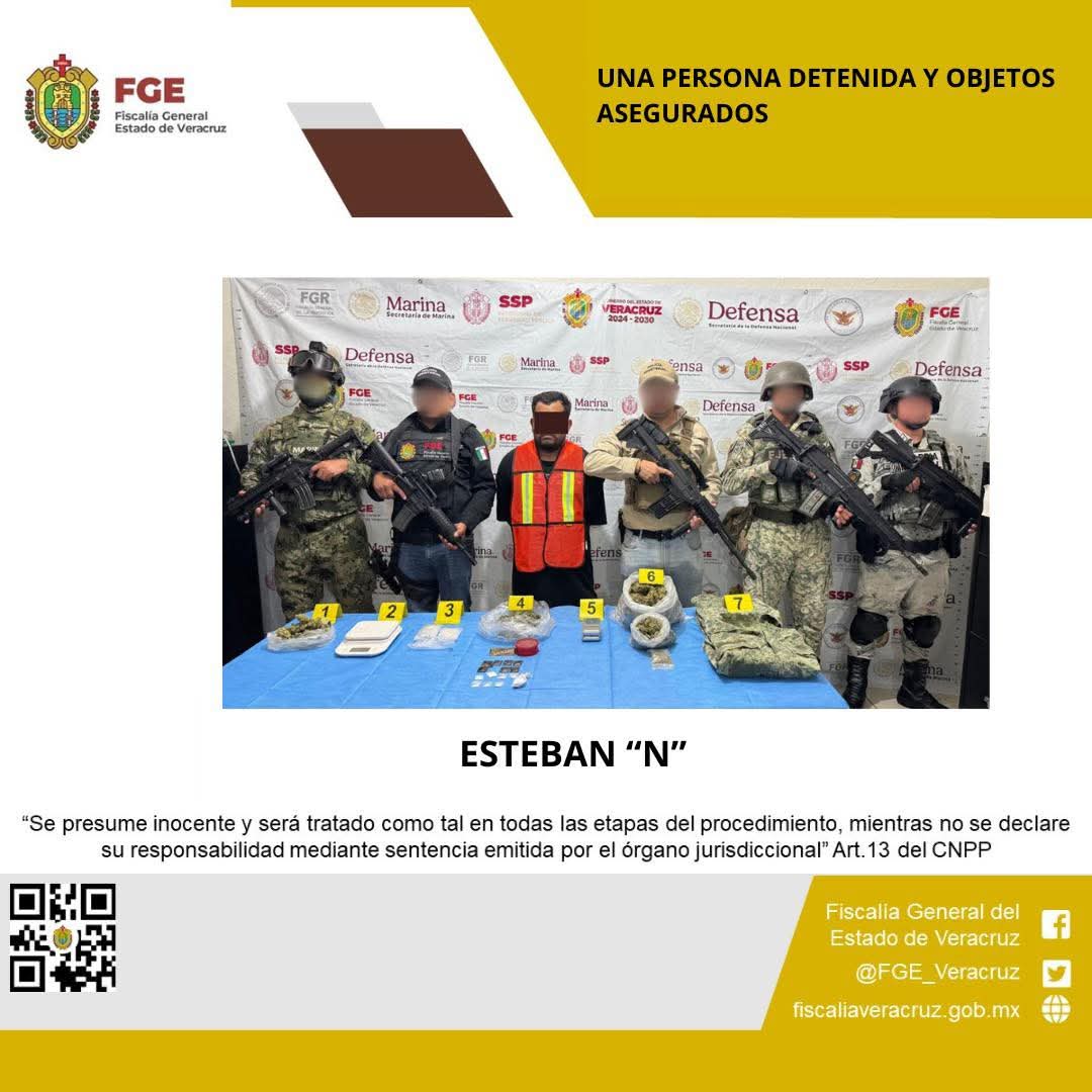 En dicho operativo se logró la detención en flagrancia de Esteban “N” y el aseguramiento de hierba verde seca con características similares a las de la marihuana, polvo color blanco, piedras color blanco con características similares a las de cristal, básculas grameras y un uniforme tipo militar.