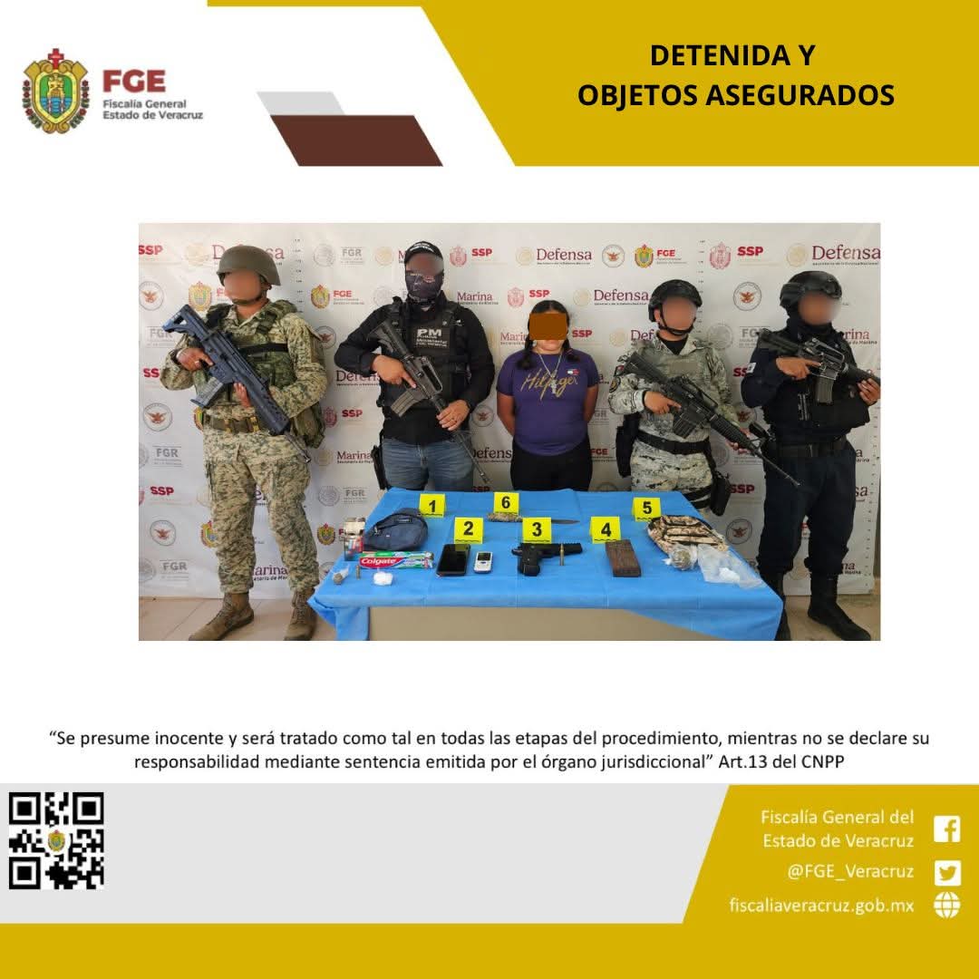 En el lugar, se logró la detención en flagrancia de Estefanía “N”, así como el aseguramiento de hierba verde seca con características similares a la marihuana y piedra cristalina, celulares, una réplica de arma corta, un cartucho útil y un cargador de arma larga.