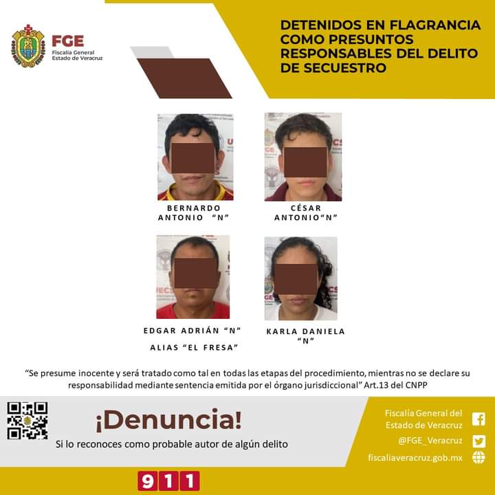 Coatzacoalcos, Ver., 4 de diciembre de 2023.- La Unidad Especializada en Combate al Secuestro en colaboración con personal de la SEDENA lograron la liberación de la víctima R.U.H., así como la detención en flagrancia de Edgar Adrián “N” alias “El Fresa”, Bernardo Antonio “N”, César Antonio “N”, Karla Daniela “N” y dos mujeres menores de edad.
