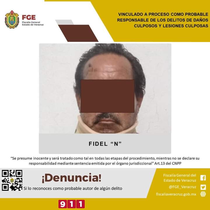 Boca del Río , Ver., 25 de junio de 2024.- La Fiscalía Regional zona centro Veracruz obtuvo vinculación a proceso en contra de Fidel “N”, como probable responsable de los delitos de daños culposos y lesiones culposas, cometidos en agravio de las víctimas H.J.P.C., O.V. V., y un menor de edad de identidad resguardada.