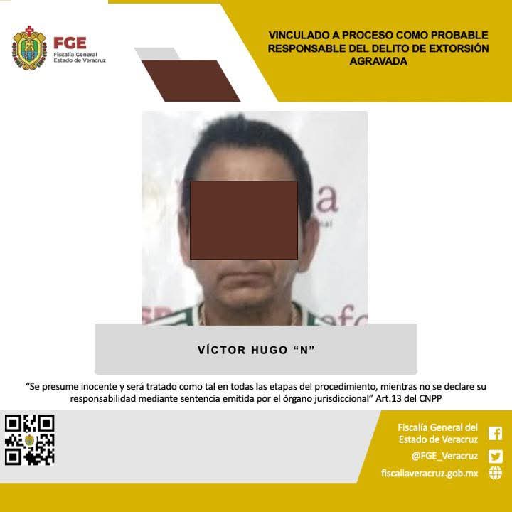 Tantoyuca, Ver., 27 de marzo de 2025.-La Fiscalía Regional Tantoyuca obtuvo vinculación a proceso en contra de Víctor Hugo “N” como probable responsable del delito de extorsión agravada, en agravio de H.A.V.R.