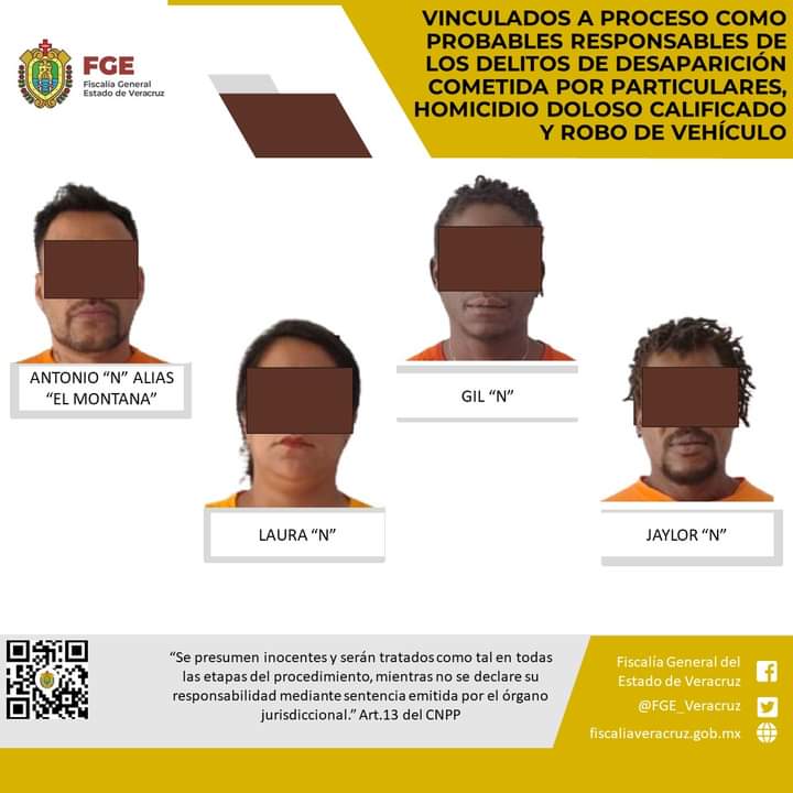 Xalapa, Ver., 6 de mayo del 2024.- Un juez de control de este distrito judicial emitió vinculación a proceso en contra de Antonino “N” alias “El Montana”, Laura “N”, Gil “N” y Jaylor “N” como probables responsables de los delitos de desaparición cometida por particulares y homicidio doloso calificado cometido en agravio de la víctima identificada con las iniciales L.M.F.O., así como robo de vehículo en agravio de L.E.V.M. dentro del proceso penal 737/2023.