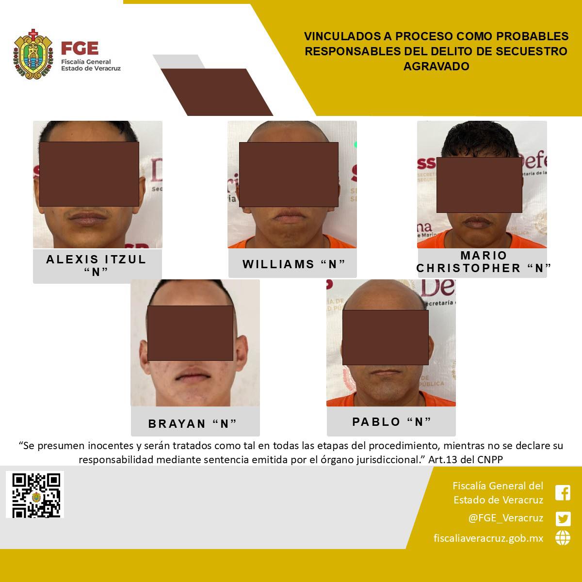 Acayucan, Ver., 22 de abril de 2025.-La Fiscalía Regional Coatzacoalcos obtuvo vinculación a proceso en contra de Alexis Itzul “N”, Williams “N”, Mario Christopher “N”, Brayan “N” y Pablo “N” como probables responsables del delito de secuestro agravado, en agravio de las víctimas D.M.M., y G.M.P.
