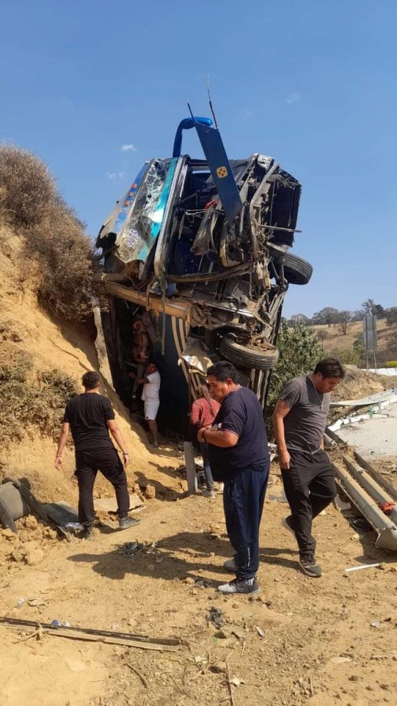 El vehículo de pasajeros termino en posición vertical con la parte trasera hacia el precipicio y la parte delantera hacia arriba dejando a múltiples pasajeros con lesiones de consideración, así como a cuatro de ellos muertos debido al impacto.